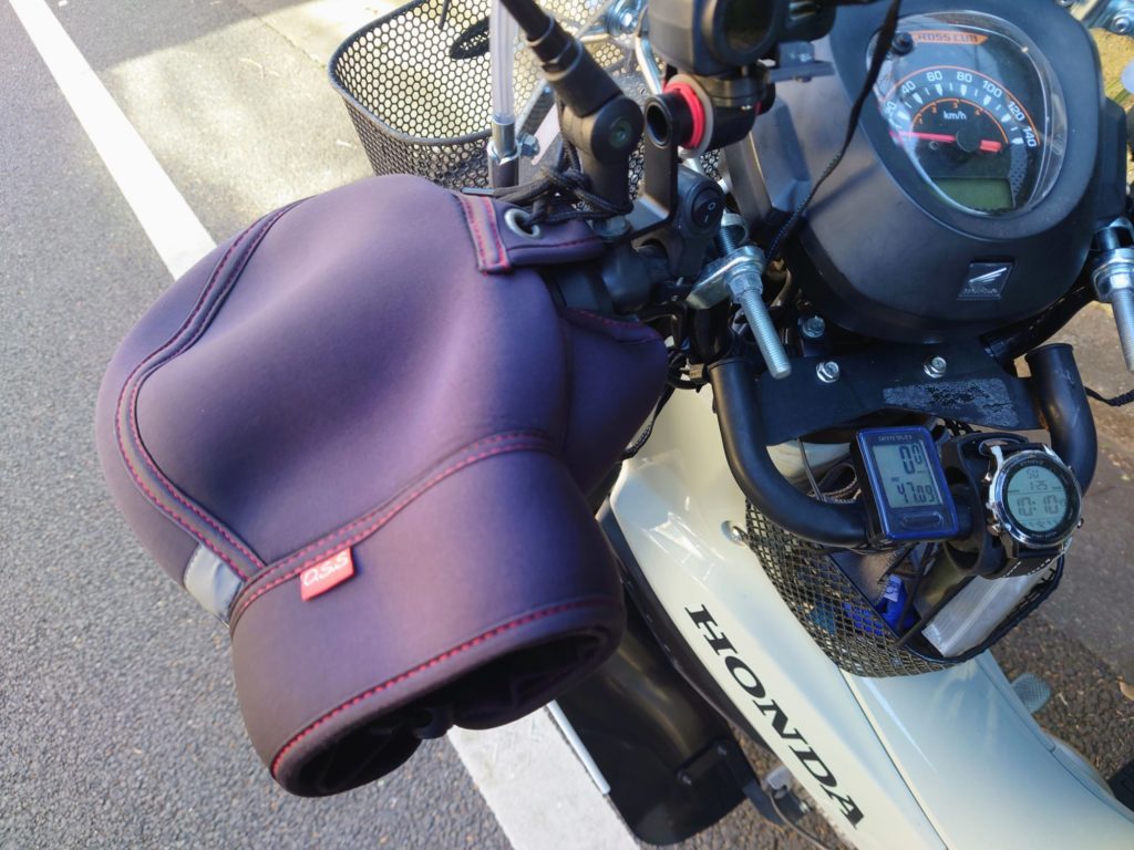 手をカバーするのは定番のハンドルカバー、通称:ハンカバ