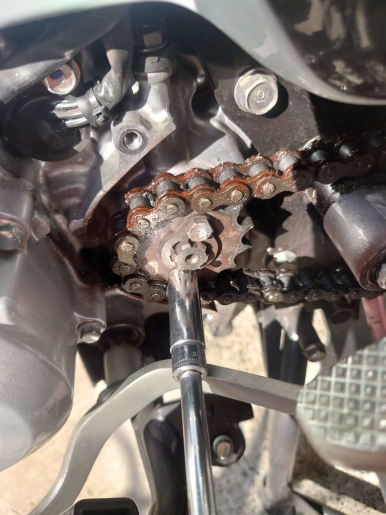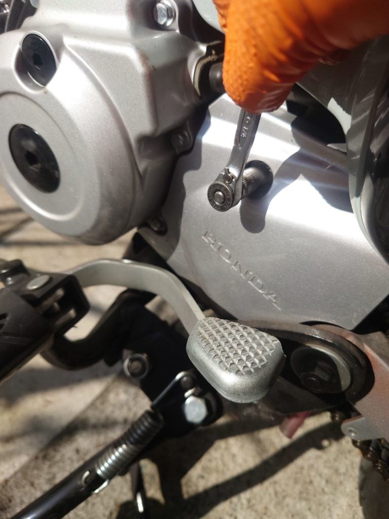 ギアを入れ、リアタイヤを接地させた状態 で作業すると楽。