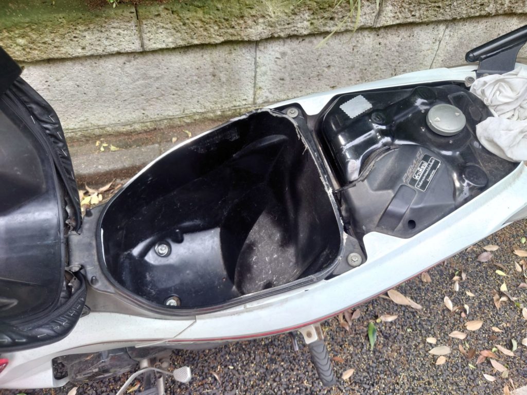カブ系なのにメットイン。これがとんでもなく便利。入るヘルメットは限られるけど小物入れ、工具入れ、などなどほんとに便利。