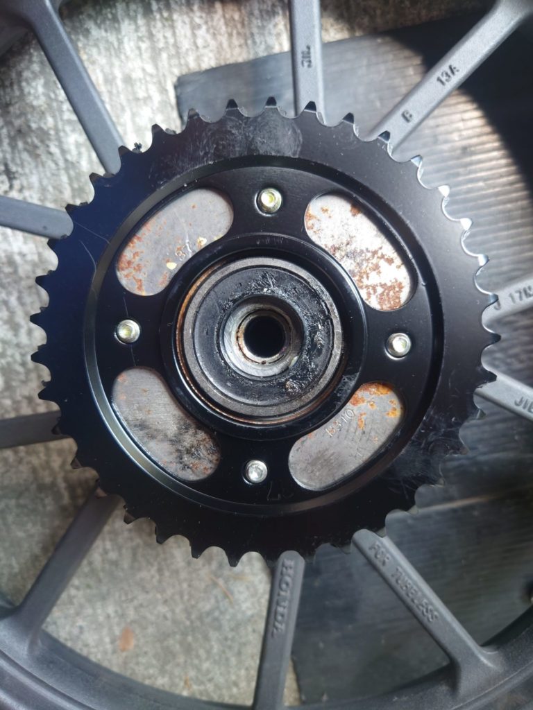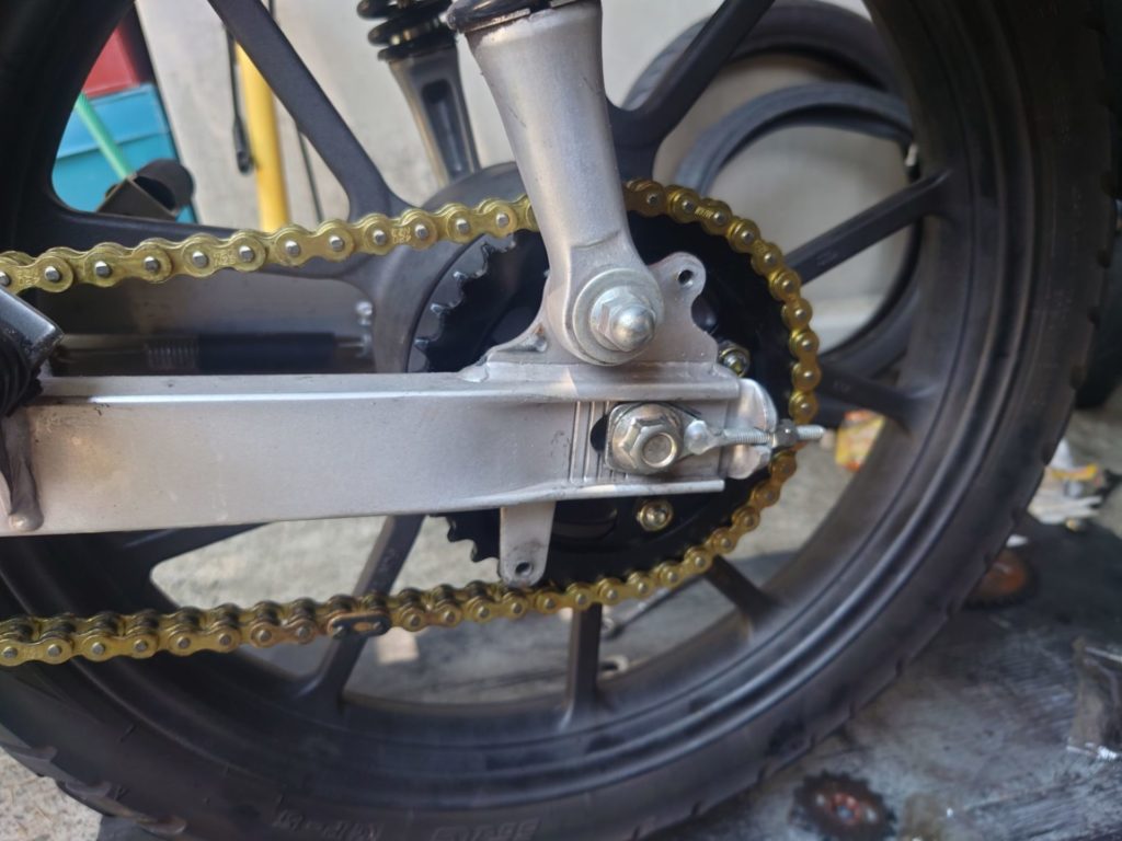 タイヤを接地させた状態でギアを入れてスプロケットのボルトナットを増し締めした。