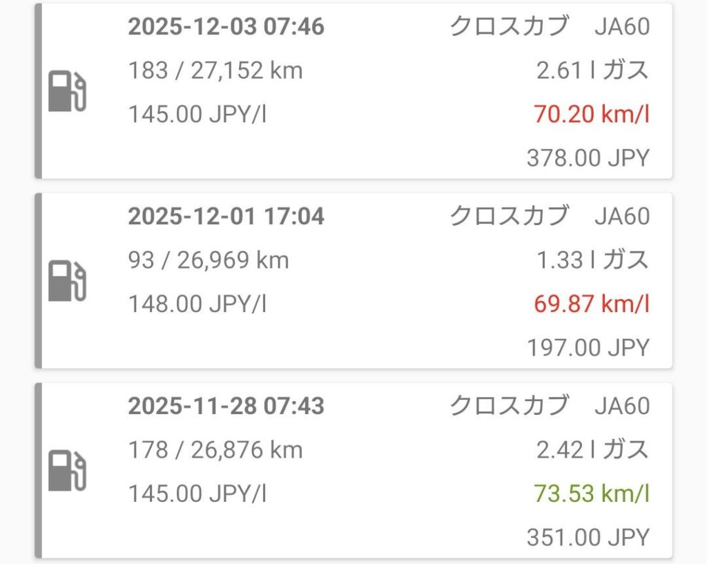 まだ15℃前後あるので真冬には遠いけど最近の燃費はというと